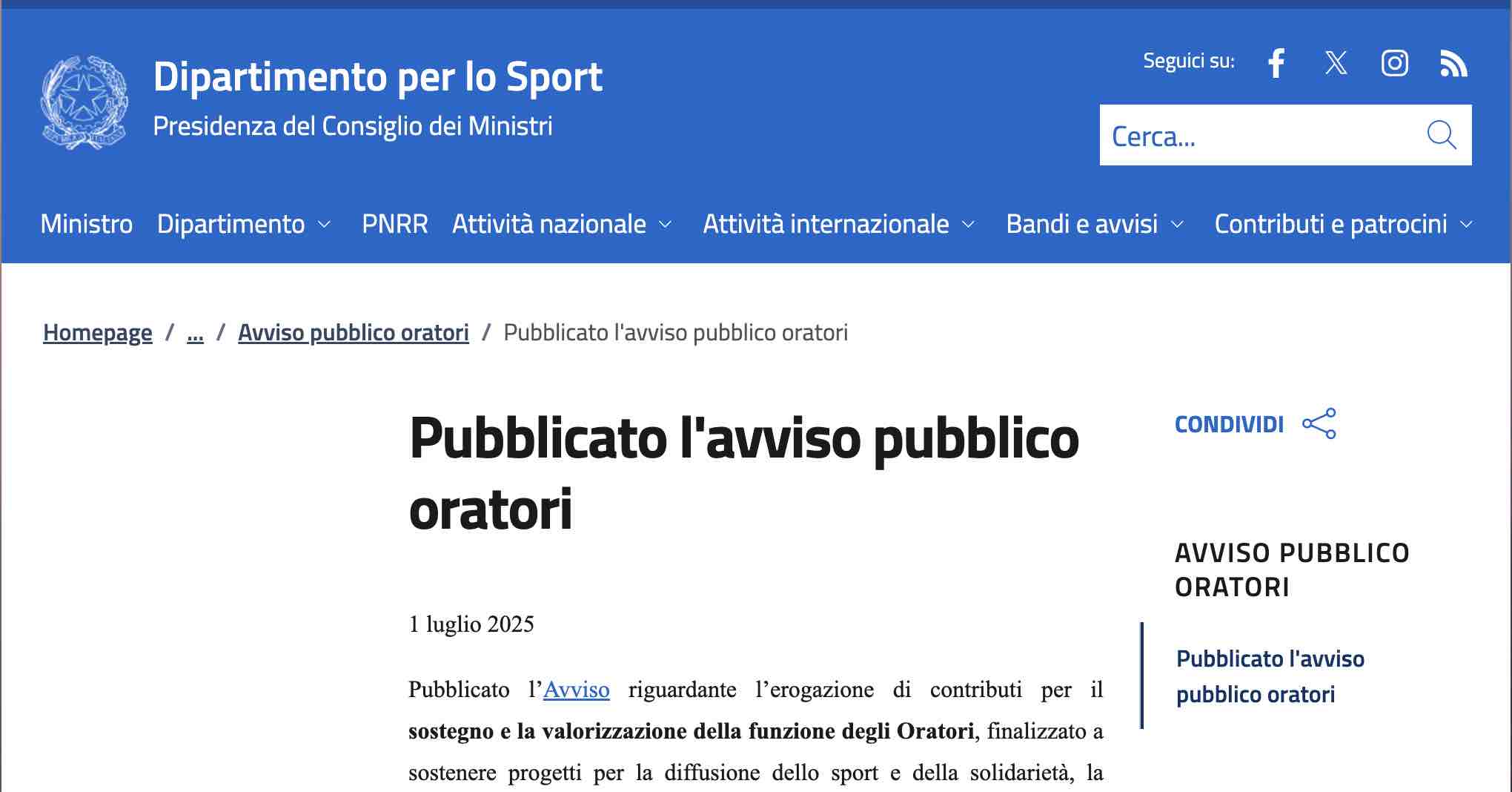- Piattaforma per la candidatura: https://avvisibandi.sport.governo.it/
