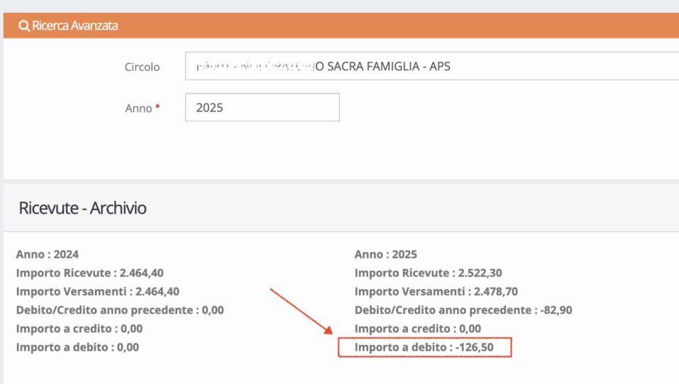 Per verificare la situazione contabile dell’ente: accedere a NOIhub, sezione ricevute, voce “importo a debito” dell’anno 2025.