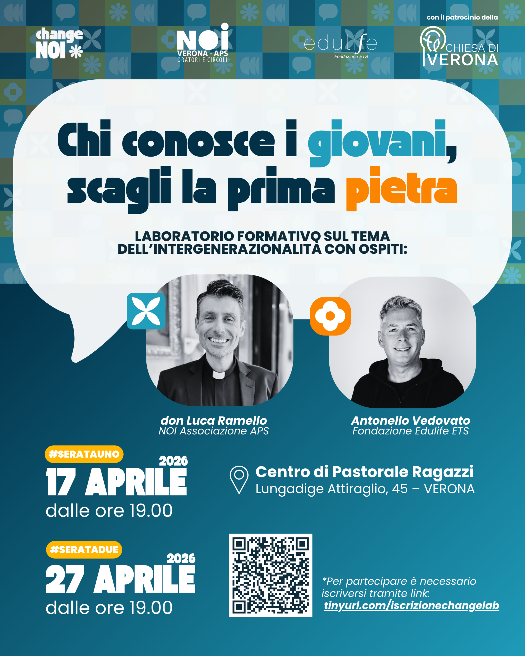 avremo la possibilità di vivere un laboratorio di stimolo e confronto con Ospiti che stanno dedicando la loro vita ai giovani: Don Luca Ramello (presidente di NOI Associazione, educatore e parroco), Antonello Vedovato (fondatore del gruppo Edulife, dello spazio ibrido 311 Verona, salesiano cooperatore) e il nostro vescovo Domenico Pompili.
