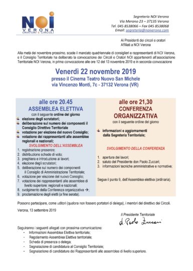 Alla metà di novembre prossimo, scade il mandato di consiglieri e rappresentanti di NOI Verona APS, viene quindi convocata dal Presidente don Paolo Zuccari l’assemblea elettiva per il giorno